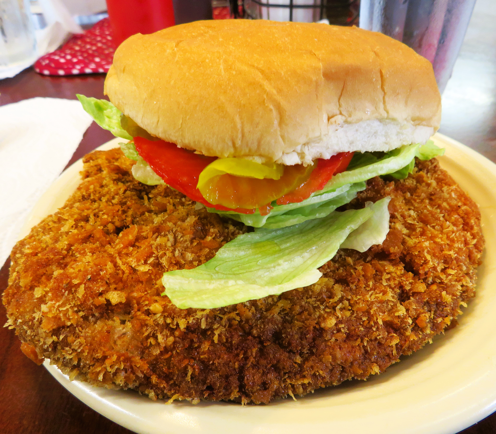 The menu is basic, featuring a number of sandwiches, a few Mexican offerings, a series of hotdogs, and a selection of salads. I chose the Tenderloin Sandwich ($9.00) with mayonnaise, iceberg lettuce and tomato. Laurie went for the Chicken Club ($9.00) with fried chicken, mayonnaise, lettuce, tomato and bacon on a hoagie roll.