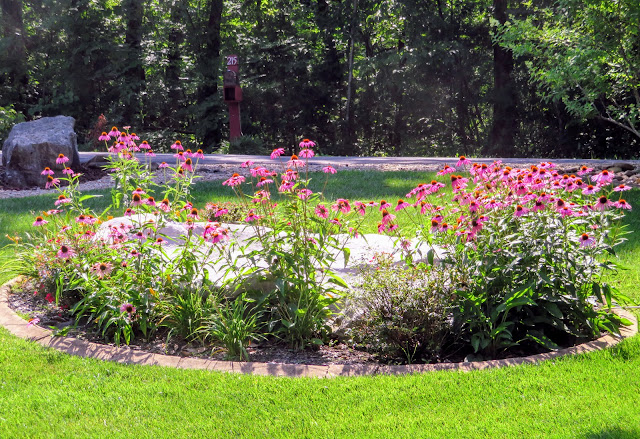 Our circular flower bed in the front yard has been very colorful this year.  The drift roses did fine and the Stella-D'Oro day-lilies as well but the purple cone flowers were spectacularly successful!  They are constantly covered by a plethora of different types of bees!  Once the flowers dry up, the cone flowers are swarmed by Goldfinches!