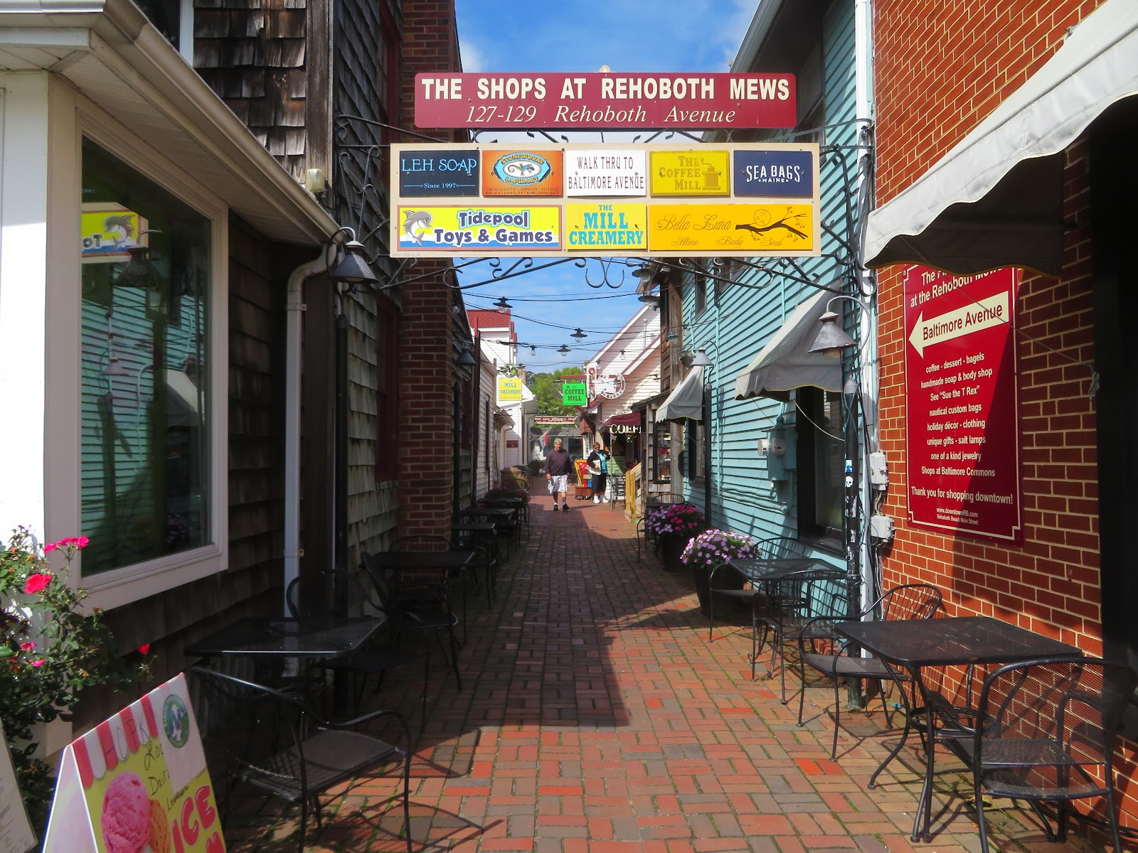 view of the downtown area or commercial center of Rehoboth Beach. This wide street is lined with gift shops,